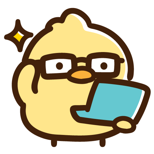 水色のノートパソコンを持ってメガネをエリート風にカチャカチャさせるひよこのイラストです。